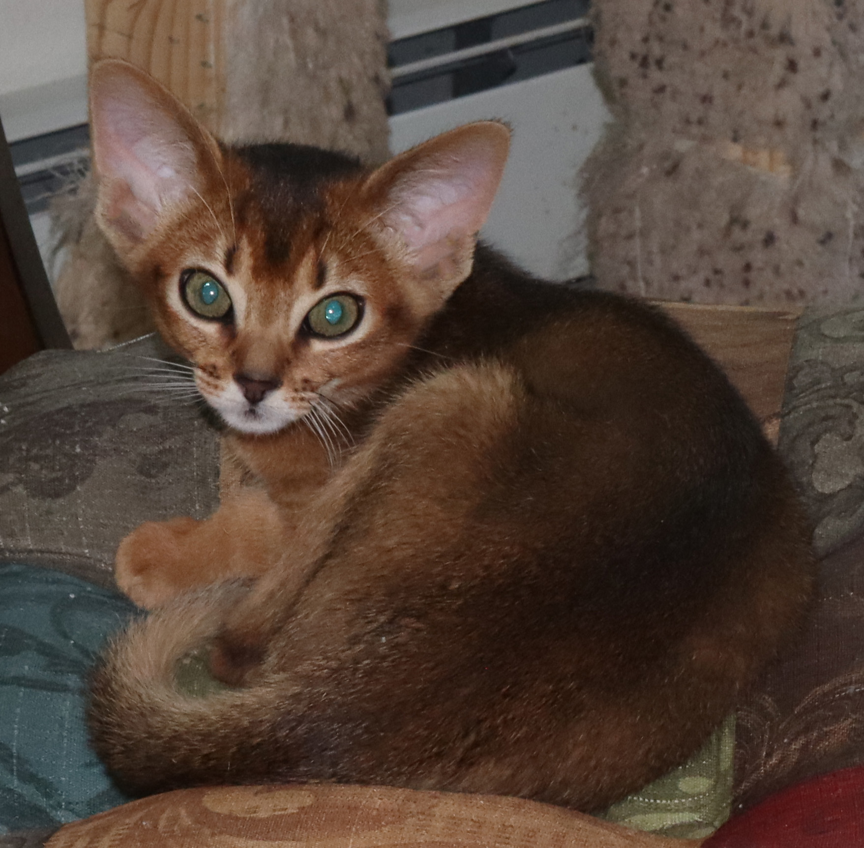 We may have a ruddy Abyssinian male kitten available in late April. This is a very active kitten, he will need another cat as a companion as he likes to play. He would not be well suited for a household with very young children, he will need a cat savvy family with older children. He may adjust to a gentle dog with a proper introduction. Please e-mail us for details.